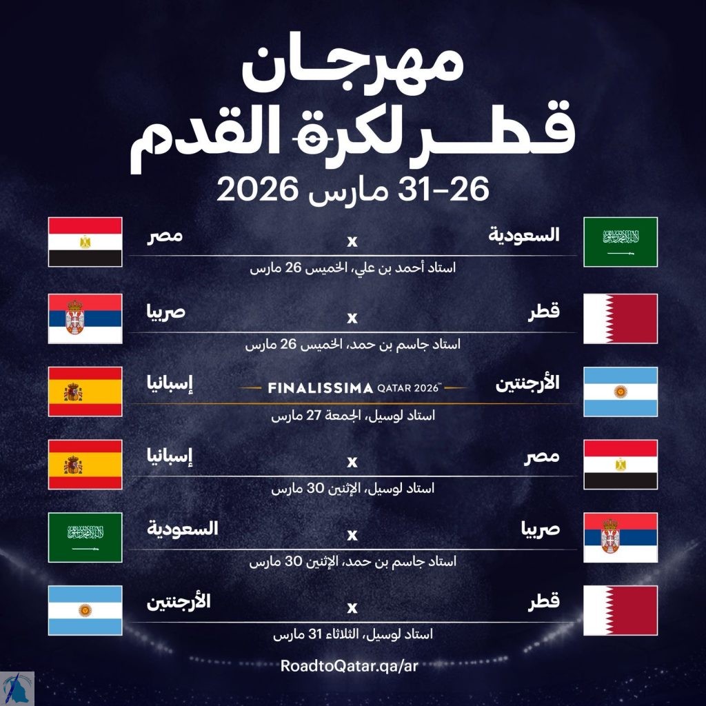 أعلنت اللجنة المحلية المنظمة لأحداث كرة القدم عن مهرجان قطر لكرة القدم 2026 الذي سيعقد خلال الفترة من 26 إلى 31 مارس. وسيضم المهرجان مباراة كأس فيناليسيما 2026، إلى جانب عدد من المباريات الدولية التي تجمع نخبة من المنتخبات استعدادًا لمشاركتها في بطولة كأس العالم قطر 2026™️، بما يتيح لها الوقوف على جاهزيتها الفنية والتنافسية قبل انطلاق الحدث العالمي ضالمرتقب.